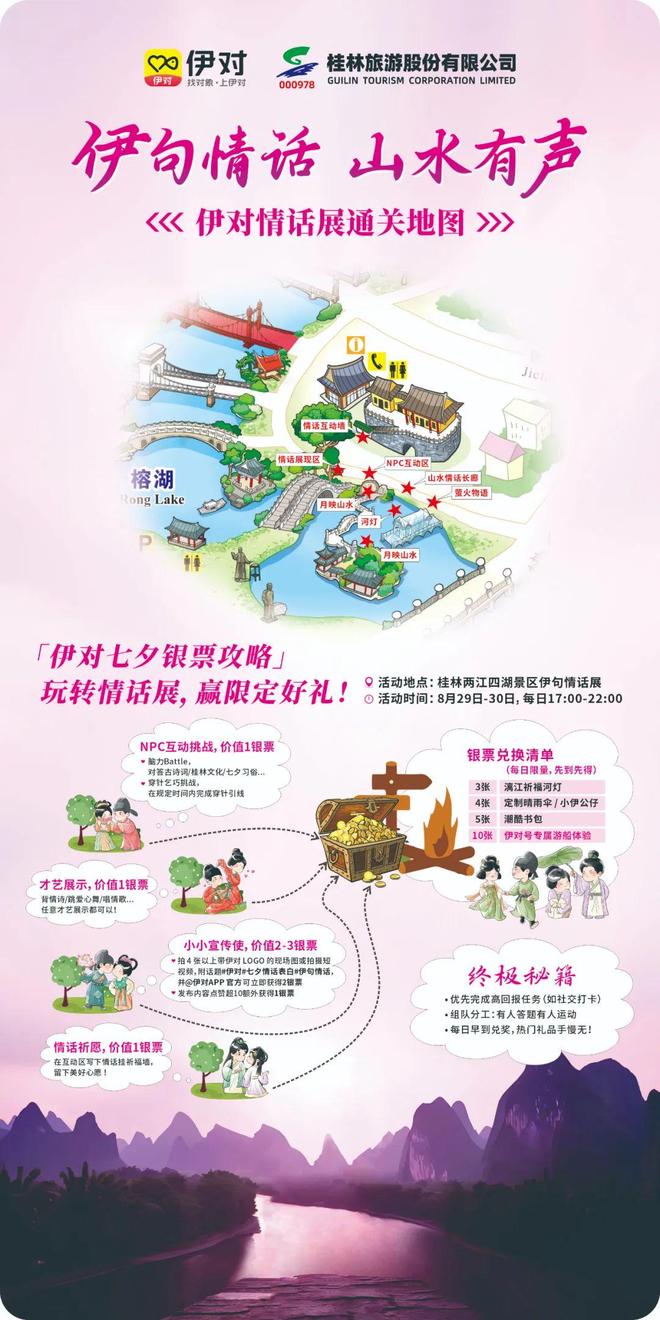 活动选址在桂林旅游股份有限公司旗下两江四湖景区核心区域,沿古南门、沿湖步道、古榕双桥形成互动路线,串联周边众多历史文化景点,让参与者在感受浪漫氛围的同时,领略桂林山水与人文底蕴的交融之美。